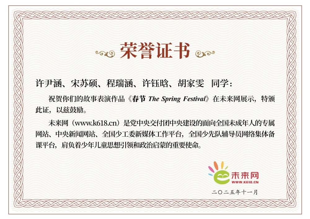 学生证书-文化中国-许尹涵、宋苏硕、程瑞涵、许钰晗、胡家雯