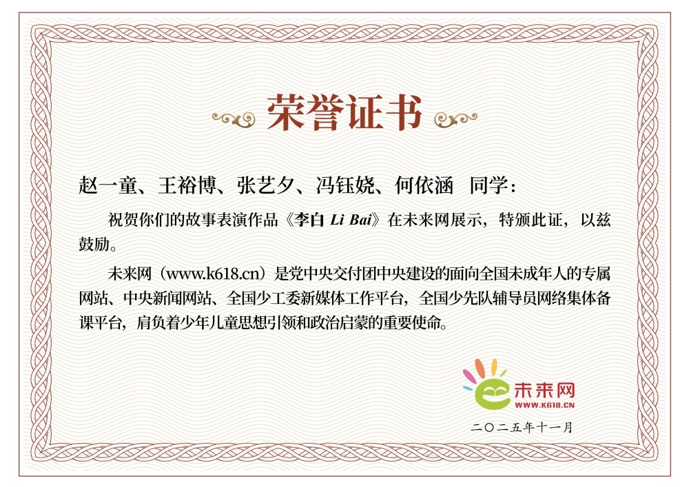 学生证书-文化中国-赵一童、王裕博、张艺夕、冯钰娆、何依涵